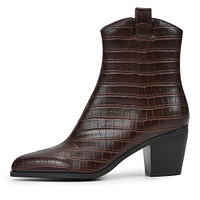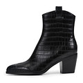 Стильные черные ботильоны в стиле казаков. Верх выполнен из кожи из спилка, текстурированной под крокодила. Подкладка и стелька утеплены мягким ворсином. Резиновая подошва отличается прочностью и хорошим сцеплением с любой поверхностью. Характерный скошенный каблук высотой 7 см устойчив и грамотно распределяет нагрузку на стопы.