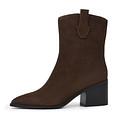 Лаконичные коричневые ботильоны с декоративным ремешком в стиле ковбойской обуви. Материал верха - бархатистый спилок. Мягкие подкладка и стелька из ворсина обеспечивают тепло и комфорт в процессе носки. Резиновая подошва отличается прочностью. Широкий каблук высотой 6,8 см устойчив и визуально вытягивает силуэт.