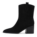 Лаконичные черные ботильоны с декоративным ремешком в стиле ковбойской обуви. Материал верха - бархатистый спилок. Мягкие подкладка и стелька из ворсина обеспечивают тепло и комфорт в процессе носки. Резиновая подошва отличается прочностью. Широкий каблук высотой 6,8 см устойчив и визуально вытягивает силуэт.