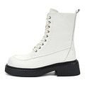 Минималистичные молочные ботинки с высокой шнуровкой. Материал верха - матовая кожа из спилка. Подкладка и стелька утеплены натуральной шерстью для оптимальной терморегуляции стоп. Высокая контрастная подошва из материала ТЭП отличается легкостью, морозоустойчивостью и хорошим сцеплением в любой поверхностью. Модель с удобной застежкой на молнию.