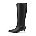 Сапоги с зауженным мысом и боковой молнией сшили из кожи из спилка. Цвет пары - чёрный. Материал подкладки и стельки - ворсин, износостойкий и гипоаллергенный материал, который не только дарит ощущение мягкости, но и активно участвует в терморегуляции стопы .Модель на каблуке 45 мм дополнили узким ремешком с прямоугольной пряжкой.
