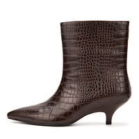 Ботильоны с тиснением под рептилию изготовили из кожи из спилка. Пара чёрного цвета. Демисезонная модель со свободным голенищем без молнии. Подкладка и стелька из ворсина — идеальный баланс: удерживает тепло, но при этом «дышит», не позволяя ногам вспотеть и замёрзнуть. Материал подошвы ботильонов - резина, высота каблука 52 мм.