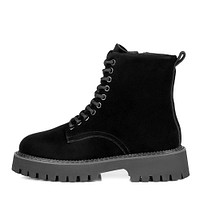 Базовые бежевые ботинки на массивной подошве с верхом из спилка с бархатистой фактурой. Пара утеплена мягкой натуральной шерстью. Модель со шнуровкой и молнией дополнена практичной петлей на голенище, ускоряющей процесс надевания обуви.