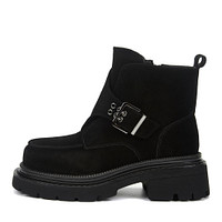 Графичные рыжие ботинки с эффектной пряжкой. Верх выполнен из прочного спилка с бархатистой фактурой. Стелька из мягкой натуральной шерсти согревает стопы при минусовой температуре. Высокая подошва из ТЭП с выраженными протекторами отличается легкостью, морозоустойчивостью и хорошим сцеплением с любой поверхностью. Модель с удобной застежкой на молнию.