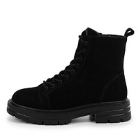 Базовые черные ботинки из гладкой натуральной кожи. Пара с подкладкой и стелькой из мягкой шерсти, защищающей стопы от холода в любую погоду. Гибкая резиновая подошва гарантирует оптимальную поддержку стоп и устойчивость на разных покрытиях даже в дождь. Модель со шнуровкой дополнена удобной застежкой на молнию. Петля на голенище ускоряет процесс фиксации обуви.