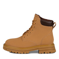 Практичные бежевые кожаные ботинки в стиле трендовых "тимберлендов". Натуральная шерсть на подкладке и стельке отлично защищает стопы от холода. Массивная резиновая подошва отличается прочностью и обеспечивает хорошее сцепление с поверхностью. Утолщенный ворот добавляет комфорта в зоне щиколоток.