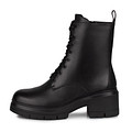 Удобные черные кожаные ботинки на широком каблуке. Густой натуральный мех на подкладке и стельке хорошо защищают стопы от холода. Рифленая подошва из материала ТЭП гарантирует устойчивость на разных покрытиях. Модель со шнуровкой дополнена удобной застежкой на молнию и практичной петлей на голенище, ускоряющей процесс фиксации обуви.