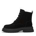 Базовые черные ботинки с высокой шнуровой. Верх выполнен из бархатистого спилка. Пара утеплена мягким ворсином. Высокая тракторная подошва из материала ТЭП обеспечивает надежное сцепление с любой поверхностью.