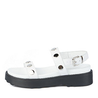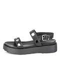 Комфортные женские сандалии черного цвета – это универсальная обувь, которая придаст повседневному летнему образу нотку динамичности и брутальности. Верх и подкладка модели – кожаные, стелька сделана из натуральной кожи особой выделки. Обувь на массивной подошве с небольшим утолщением под пяткой (высота – 4 см). Модель декорирована металлическими заклепками.