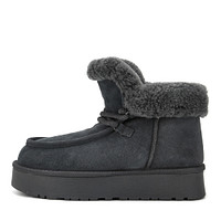Ботинки с широкой протекторной подошвой, подкладом из натуральной шерсти сшили из спилка. Зимняя пара с рельефным швом, подчеркивающим округлый мыс. Подошва из ТЭП прочная и устойчива к истиранию.
