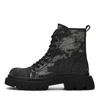 Акцентные серые текстурированные ботинки. Верх - комбинация плотного текстиля и мягкой кожи из спилка. Подкладка и стелька утеплены ворсином. Высокая тракторная подошва из резины обеспечивает надежное сцепление с поверхностью. Для облегчения процесса надевания предусмотрена молния.