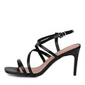 Эффектные кожаные босоножки на высоком каблуке выполнены в черном цвете. Мягкая подкладка обеспечивает комфорт стоп и идеальную посадку. Тонкий каблук высотой 85 мм визуально «вытягивает» силуэт и делает его изящнее. Летние босоножки в лаконичном дизайне добавят акцент любому образу.