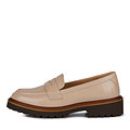 Бежевые женские лоферы на толстой подошве. Материал верха — кожа из спилка с глянцевой фактурой. Подкладка демисезонной обуви выполнена из натуральной кожи. Материал подошвы — легкий вспененный каучук с хорошими амортизирующими свойствами. Модные лоферы с контрастным рантом отлично дополнят гардероб в деловом или casual-стиле.