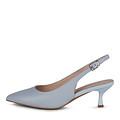Изящные кожаные туфли с открытой пяткой выполнены в голубом оттенке. Верх трендовых слингбэков изготовлен из шевро с матовой фактурой. Кожаная подкладка и утолщенная перфорированная стелька из шевро обеспечивают комфорт стоп даже при длительном ношении обуви. Детали: фигурный каблук высотой 55 мм, острый мыс, классическая застежка с пряжкой.