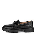 Акцентные черные лоферы из натуральной кожи с фактурой «под рептилию». За комфорт стопы отвечают кожаная подкладка и мягкая перфорированная стелька. Массивная резиновая подошва лоферов обеспечивает устойчивость и хорошее сцепление с поверхностью. Металлический декор не нарушает общей лаконичности модели.