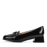 Бежевые туфли из лакированной кожи. За комфорт стоп и идеальную посадку отвечают кожаная подкладка и мягкая стелька из шевро. Демисезонные туфли на устойчивом каблуке декорированы крупной цепью. Трендовый квадратный мыс добавляет паре характера.