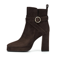 Минималистичные темно-бежевые ботильоны из мягкого ворсистого велюра. Пара утеплена ворсином, обеспечивающим надежную защиту от холода. Графичный каблук высотой 110 мм формирует оптимальный уровень поддержки. Модель с удобной застежкой на молнию и практичной петлей на голенище.