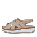 Бежевые сандалии из спилка на платформе. Широкие ремешки с кожаной подкладкой бережно фиксируют пару на ноге. Перфорированная стелька из шевро обеспечивает комфорт стоп. Легкая подошва из материала ТЭП формирует оптимальную поддержку и устойчивость. Пара идеально впишется в образы для жаркой погоды.