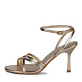 Эффектные золотые босоножки из гладкой кожи шевро. Комфорт стоп обеспечивают кожаная подкладка и стелька из нежной кожи шевро. Пара отлично впишется в образы с брючными костюмами, воздушными платьями и юбками. Тонкий каблук высотой 90 мм  делает силуэт визуально изящнее.