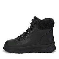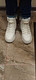 Белые кожаные ботинки в спортивном стиле. Модель утеплена натуральной шерстью, а подошва из материала ТЭП отличается гибкостью и морозоустойчивостью. Сочетание боковой молнии и шнуровки обеспечивает комфортную посадку по ноге. Лаконичность дизайна позволяет сочетать ботинки с любым образом.