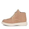 Удобные бежевые ботинки из мягкого бархатистого велюра. Пара утеплена мягким ворсином. Изогнутая подошва из резины обеспечивает комфортную поддержку стоп. Модель с практичной застежкой на молнию и прочной шнуровкой.