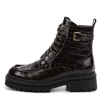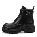 Акцентные черные женские ботинки из натуральной кожи с фактурой «под рептилию». Пара утеплена мягким ворсином. Гибкая подошва из материала ТЭП хорошо поддерживает стопы при ходьбе и обеспечивает надежное сцепление с поверхностью. Модель со шнуровкой, удобной молнией и декоративным ремешком с пряжкой.