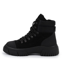 Темно-зеленые ботинки из мягкого ворсистого спилка с усиленным мыском и пяткой. Пара утеплена натуральной шерстью. Рифленая подошва из материала ТЭП гарантирует хорошее сцепление с любыми покрытиями. Лаконичная шнуровка и практичная застежка на молнию обеспечивают отличную фиксацию пары на ноге.