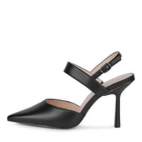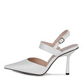 Изящные белые кожаные туфли с открытой пяткой. Идеальную посадку и комфорт стоп гарантируют подкладка из натуральной кожи и стелька, изготовленная из мягкой кожи шевро. Эффектный каблук высотой 95 мм визуально делает силуэт миниатюрнее. Модель с классическим замком с пряжкой.