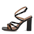 Черные кожаные босоножки с трендовым квадратным мысом. Кожаная подкладка и стелька из нежной кожи шевро обеспечивают комфорт стоп в течение всего дня. Графичный каблук высотой 87 мм обеспечивает равномерное распределение нагрузки по стопе. Изящные ремешки надежно фиксируют пару на ноге.