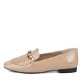 Лоферы приятного бежевого цвета с холодным подтоном. Модель сделана из лакированной кожи с ярким глянцевым блеском. Дизайн туфель лаконичный: невысокий каблук, тонкая ровная подошва, вытянутый скругленный носок. В верхней части – декор: перемычка и кожаная бахрома.