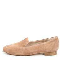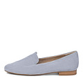 Голубые удобные туфли по типу лоферов. Модель на тонкой подошве, практически без каблука (его высота – 1,6 см). Туфли закрывают ступню, но оставляют открытой лодыжку. Модель сделана из мягкого велюра – красивого фактурного материала. Подошва резиновая.