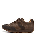 Коричневые кроссовки из комбинированных материалов: натуральная кожа и бархатистый спилок. Материал подкладки и стельки у демисезонной обуви - натуральная кожа. Кроссовки поставили на широкую подошву с протектором, заходящим на пятку. Задник украшен металличекой эмблемой бренда.