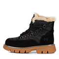 Практичные чёрные женские ботинки выполнены в стиле треккинговой обуви. Комбинированный верх из нубука и текстиля надежно защищает стопы от осадков и холода. Подкладка и стелька выполнены из мягкой натуральной шерсти и меха. Массивная рифленая подошва из резины обеспечивает отличное сцепление с покрытием и комфорт при движении по любым поверхностям. Модель дополнена прочной шнуровкой, позволяющей регулировать посадку пары.