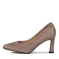 Классические туфли-лодочки темно-бежевого цвета с заостренной носочной частью. Верх модели выполнен из мягкого велюра с бархатистой фактурой, подкладка — из натуральной кожи. Стелька модных женских туфель изготовлена из нежной кожи шевро. Фигурный каблук 80 мм визуально делает силуэт изящнее.