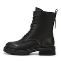 Чёрные ботинки сшили из кожи из спилка. Модель с подкладкой из натуральной шерсти сохраняет тепло. Шнуровка обеспечивает идеальную посадку по ноге, а боковая молния и петля на заднике ускоряет процесс переобувания. Прочная подошва из ТЭП высотой 40 мм.