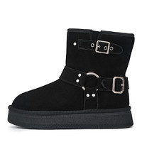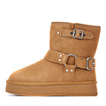 Угги песочного цвета изготовили из бархатистого спилка. Голенище зимней пары декорировали ремешками и пряжками с металлическими люверсами. Материал подкладки и стельки натуральная шерсть. Резиновая подошва с антискользящим протектором. Стильный выбор на каждый день.