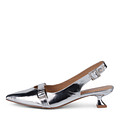 Эффектные серебряные кожаные туфли с открытой пяткой. Комфорт стоп и идеальную посадку обеспечивают подкладка и стелька из нежной кожи шевро. Фигурный каблук высотой 43 мм формирует оптимальное распределение нагрузки по стопе.  Трендовая модель "слингбэк" гармонично дополнит образы с брюками, платьями и воздушными юбками.