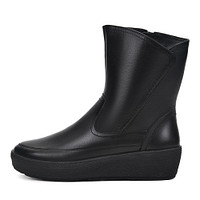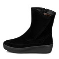 Удобные черные полусапоги из ворсистого спилка. Пара утеплена мягким натуральным мехом. Модель с практичной застежкой на молнию и миндалевидным мысом. За устойчивость на любых покрытиях отвечает прочная подошва из материала ТЭП.