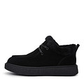 Укороченные черные угги на холодный сезон. Материал верха - прочный спилок с бархатистой фактурой. Стелька из натуральной шерсти обеспечивает комфортную терморегуляцию стоп. Высокая подошва из ТЭП отличается легкостью, морозоустойчивостью и надежным сцеплением с поверхностью. Модель фиксируется шнуровкой.