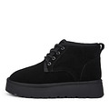 Комфортные черные угги для прогулок в холодный сезон. Верх выполнен из прочного спилка с бархатистой фактурой. Подкладка и стелька из мягкой натуральной шерсти обеспечивают оптимальную терморегуляцию стоп на улице и в помещении. Высокая рифленая подошва из ТЭП отличается легкостью, морозоустойчивостью и хорошим сцеплением с поверхностью. Модель самостоятельно фиксируется по ноге шнурками.