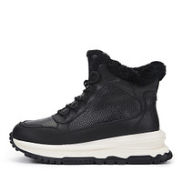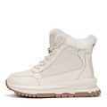 Уютные высокие кроссовки в нежном молочном оттенке. Верх выполнен из текстурированной кожи из спилка с влагонепроницаемым покрытием. Подкладка и стелька из мягкой натуральной шерсти поддерживают оптимальную температуру внутри обуви на улице и в помещении. Высокая объемная подошва из материала ТЭП с выраженными протекторами отличается легкостью, морозоустойчивостью и хорошим сцеплением с поверхностью.