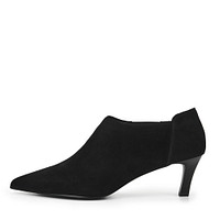 Чёрные ботильоны с зауженным мысом и высокой шпилькой выполнили из бархатистого велюра. Подкладка из текстиля, а материал стельки нежная кожа шевро. Высота каблука - 56 мм. Плотная подошва демисезонной обуви, изготовленная из тунита, отличается прочностью.