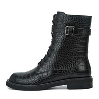 Лаконичные коричневые ботинки стилизованные под кожу рептилии. Верх - кожа из спилка. Подкладка и стелька из ворсина поддерживают оптимальную температуру внутри обуви на улице и в помещении. Высокая плотная подошва из резины устойчива на любой поверхности.