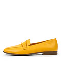 Акцентные желтые кожаные лоферы на тонкой подошве с миндалевидной носочной частью. Стелька и подкладка выполнены из мягкой кожи шевро, обеспечивающей комфортную посадку и хороший воздухообмен. Подошва из термопластичного полиуретана отличается гибкостью и износостойкостью, а также создает хорошее сцепление с поверхностью.