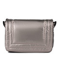 Серебристая сумка-мессенджер из мягкой искусственной кожи выполнена в футуристичном дизайне. Модель с прочной текстильной подкладкой, застежкой на молнию и поворотный замок. Длинный плечевой ремень выполнен из текстиля. Сумка гармонично впишется в повседневные и праздничные образы.