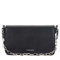 Элегантный клатч на цепочке в классическом черном исполнении. Компактная модель выполнена из гладкой искусственной кожи, которая отличается влагоустойчивостью и простотой в уходе. Внутри - одно отделение и карман для необходимых мелочей. Длина ремня позволяет комфортно носить сумку через плечо. Аксессуар надежно застегивается на молнию и магнит.