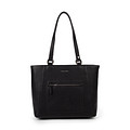 Практичная черная сумка-шопер с графичным внешним карманом на молнии. Верх выполнен из искусственной кожи, подкладка текстильная. Одно вместительное отделение, карманы для мелочей. Сумка застегивается на молнию.