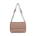 Эффектная бежевая сумка-кроссбоди из искусственной кожи с трендовой отстрочкой. Модель с акцентной цепочкой, вместительным отделением и удобными карманами для мелочей. Графичный логотип в оттенке металлик выступает в роли акцентной детали. Сумка хорошо подойдет для повседневных и вечерних аутфитов.