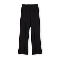 Базовые молочные брюки из полиэстера и спандекса. Модель со средней посадкой и застроченными стрелками, визуально вытягивающими силуэт. Пояс со шлевками позволяет носить брюки с ремнем или без него.