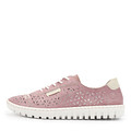 Элегантные розовые полуботинки в стиле спортивной обуви. Комбинированный верх из натуральной и искусственной кожи декорирован перфорацией в форме цветов. Высокая белая подошва из резины отличается прочностью и устойчивостью на любом покрытии. Модель фиксируется шнурками.